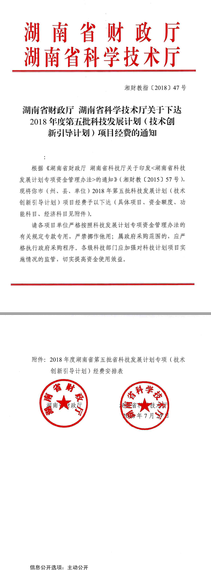 湖南省财政厅湖南省科学技术厅关于下达2018年度第五批科技发展计划(技术创新引导计划)项目经费的通知