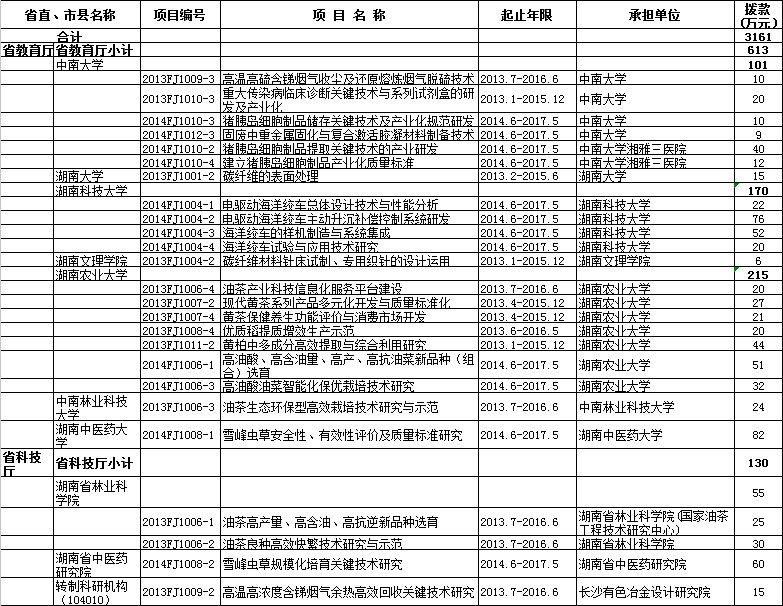 湖南省2015年第一批省级科技计划项目补助资金明细表