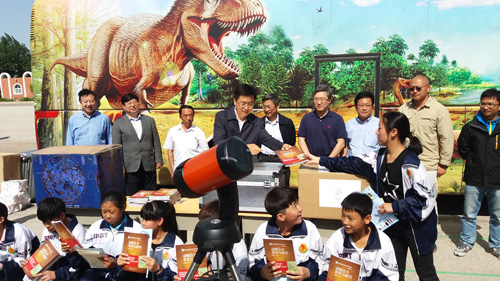 中国科学技术交流中心副主任赵新力等相关领导为喀左县二中赠送天文望远镜、创意工程科普教材等科普器材