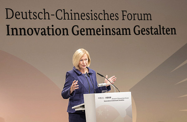 德国教育研究部部长万卡在致辞中回顾了两国近年来在创新研发领域的合作历程。她指出,德国教研部很早就开始与中国展开合作。尤其是近几年来,德中间已建立了较好的创新对话与合作平台。万卡部长认为两国在创新研发领域有待释放的合作潜力还非常大。为此,她呼吁两国今后建立共同的“创新资助机制”,以促进两国企业和科研机构更好地开展研发合作。
