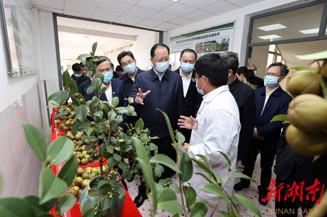 金秋十月的省林科院国家油茶种质资源收集保存库,500亩油茶林硕果满枝,一派丰收景象。这里收集保存了2500余份油茶优良种质资源,是我国资源数量最多、类型最丰富的油茶种质资源库。毛伟明指出,湖南油茶种植面积、产量和产值均居全国第一,要加快油茶良种的选育和推广,推动油茶低产林更新改造、品种升级,更好发挥油茶在乡村振兴、富裕农民中的作用。中南林科大经济林培育与保护教育部重点实验室是教育部唯一的经济林重点实验室,毛伟明强调,要推动林业科技成果尽快转化为生产力、生产效益,打通“绿水青山”向“金山银山”转化的通道。