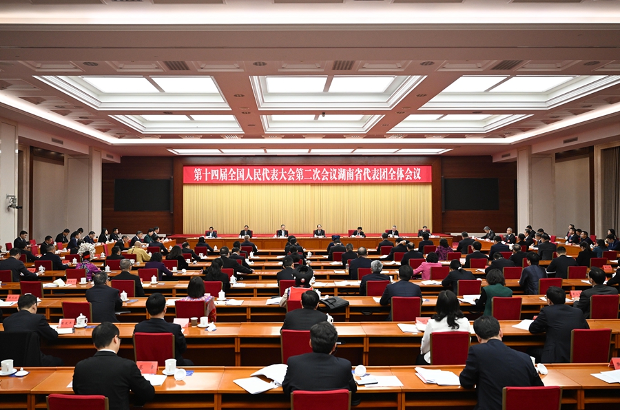3月5日,出席十四届全国人大二次会议的湖南代表团在驻地举行第三次全体会议。