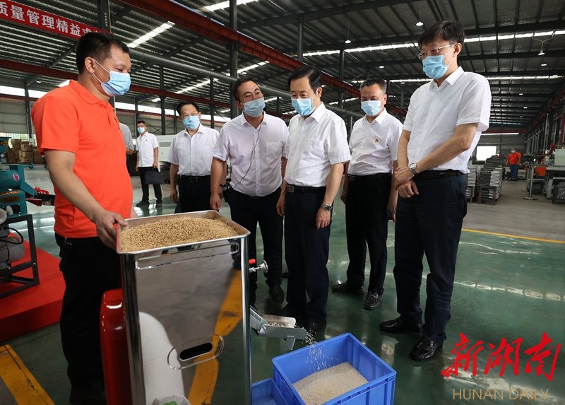 双峰县近年来致力做强农机产业,目前已集聚70家规模以上农机企业,产业增长势头良好。许达哲首先考察了劲松机械有限公司的生产经营情况,得知该企业在碾米机研发、制造领域处于领军行列,他鼓励企业负责人继续紧盯市场,推动产品量质齐升,为擦亮湖南农机品牌作出新贡献。双峰县农机展示中心里,栽插、植保、收割、烘干等农机产品琳琅满目,许达哲一边参观一边详细询问双峰永丰农机特色小镇发展建设情况,他指出,要支持龙头骨干农机企业整合产业链资源,带动更多中小农机企业共同发展,将农机产业做优做强、做出特色。