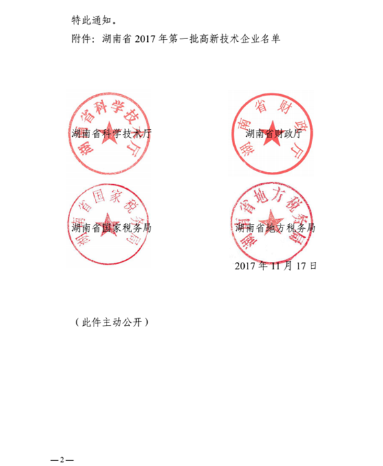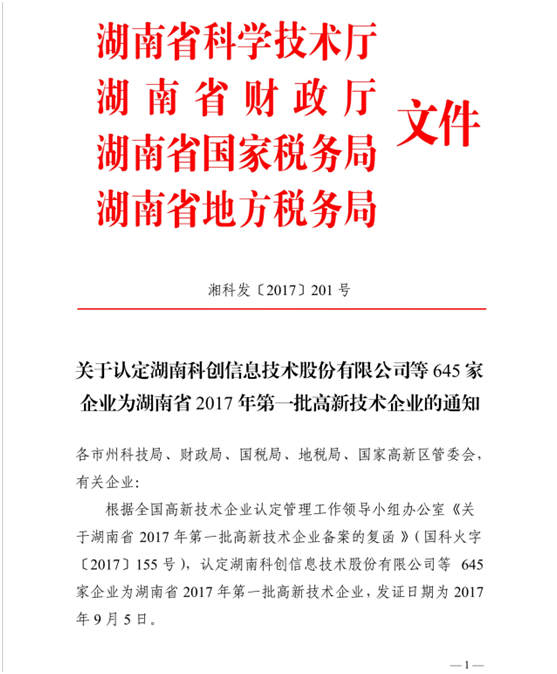 关于认定湖南科创信息技术股份有限公司等645家企业为湖南省2017年第一批高新技术企业的通知