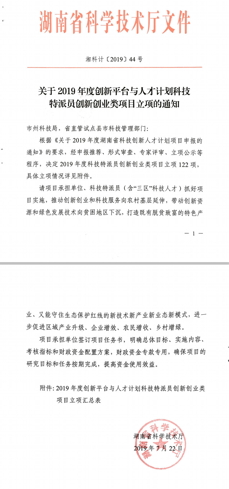 关于2019年度创新平台与人才计划科技特派员创新创业类项目立项的通知