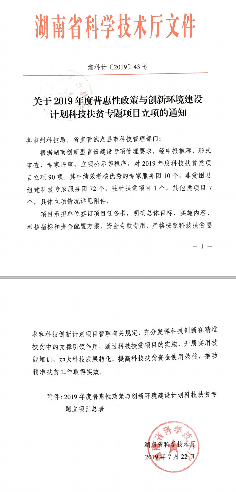 关于2019年度普惠性政策与创新环境建设计划科技扶贫专题项目立项的通知