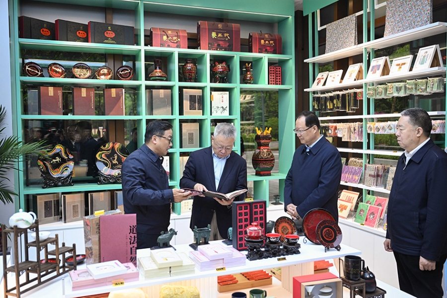 沈晓明一行从湖南烈士公园西广场步行至融合广场,听取“馆园融合”项目总体情况介绍,察看文创产品体验空间、广场经营业态。穿过广场便来到省博物馆游客服务中心,沈晓明一行了解入馆流程优化、服务升级等举措。走进省博物馆,沈晓明一行详细了解中国语言资源博物馆规划建设、马王堆研究院前期筹备及“湘当有味的马王堆”美食活动开展等情况,随后一路步行察看“潇湘红韵”演艺厅,听取湖南烈士公园相关项目建设、片区城市更新规划建设等情况汇报。